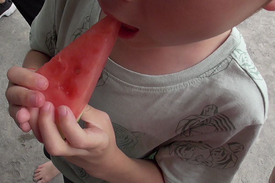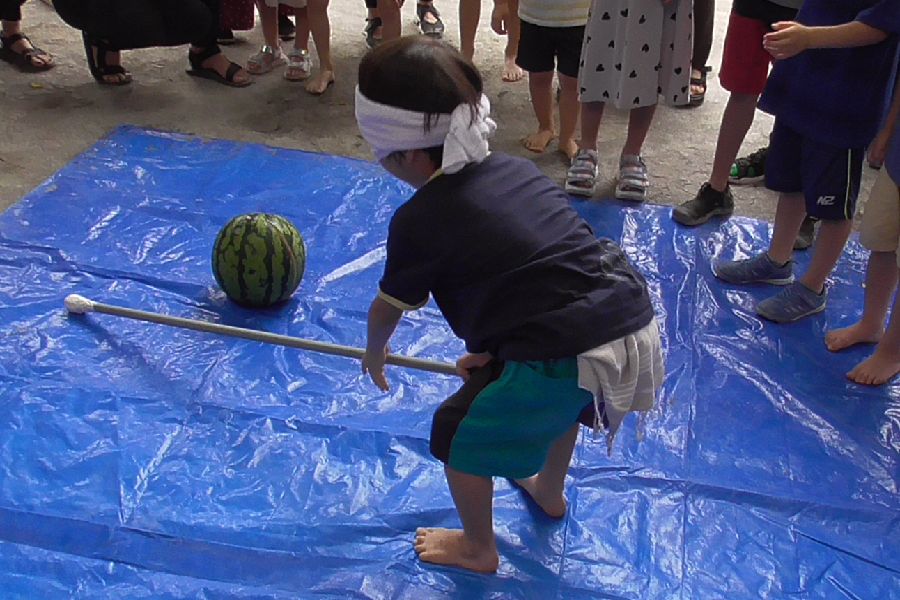 イベントの締めくくりには『スイカ割り』も行い、小さい子から小学生まで順番にチャレンジしました。「右!」「左!」「今だ!」と応援する子どもたちや大人も大盛り上がりでした。