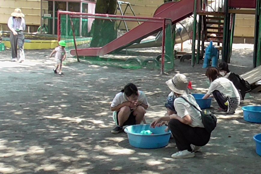 そして地熱が下がる様に園庭にはたっぷり水撒きをしてお迎えしました。本日は猛暑日でしたので予定にはなかったビニールプールも出しました。