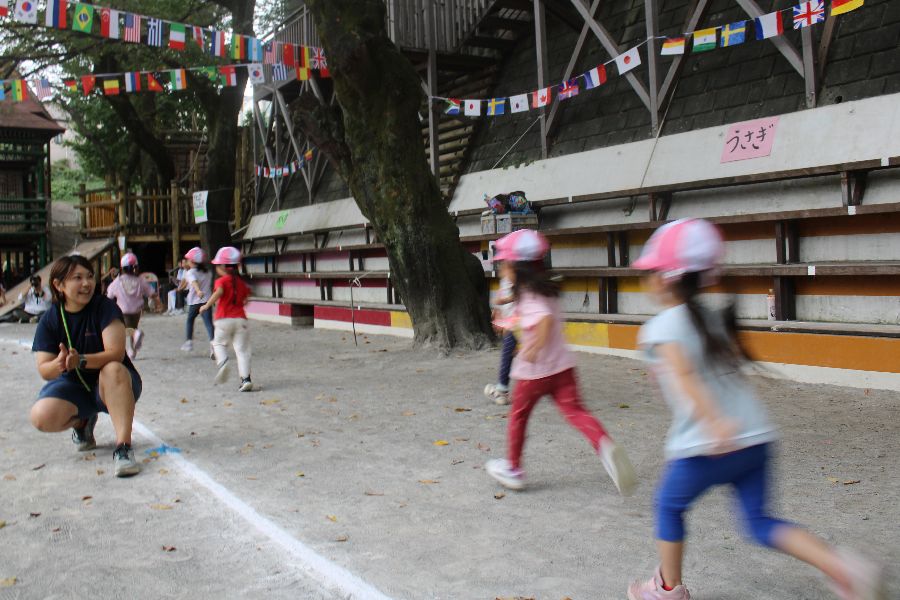 続いての種目は『はしりっこ』。文字通りトラックを約1周全力で走り抜けます。子ども達はF1のレースカーになりきってレーシングフラッグを振る副担教師の元まで駆け抜けました。