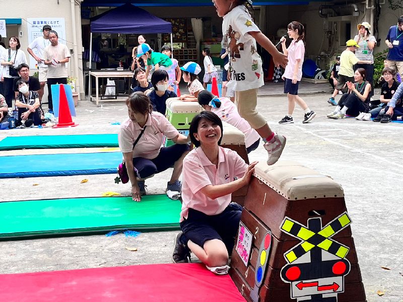 最初は跳び箱など障害物を乗り越える種目『とびばこぴょんぴょん』です。今年の『うんどうかい』のテーマは『乗り物』です。子ども達は色々な乗り物になりきって障害物にチャレンジしました。