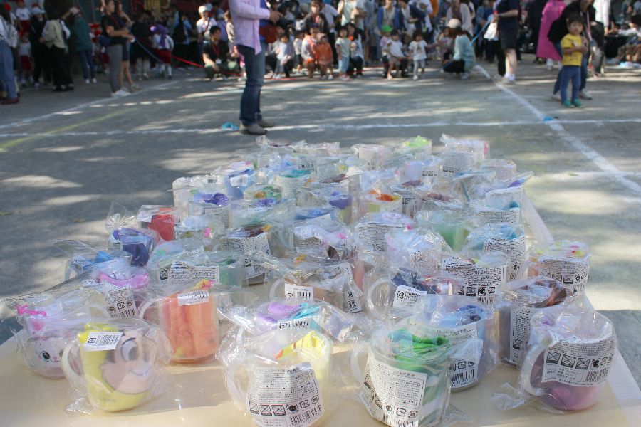 続いて未就園児参加種目を行いました。マグカップを選び、それにお好みのジュースをそそいでいただく遊びです。マグカップは「入園して幼稚園で使ってねの願いを込めた」プレゼントです。