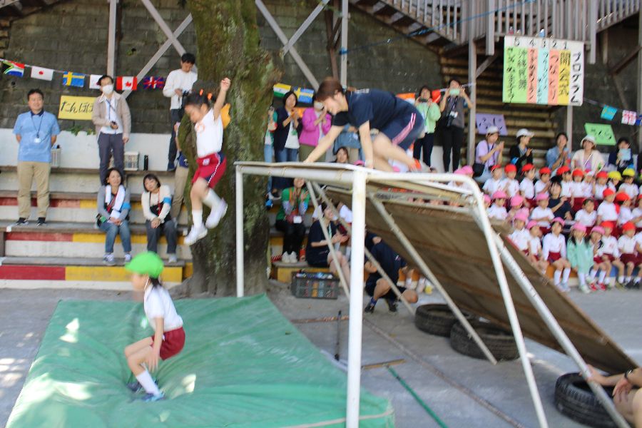 年長組の残す種目は障害物競技の『野越え山越え』と『クラス対抗リレー』です。野越え山越えでは最後に園オリジナルの『登り板』を駆け上がり勇気を出して大型マットに飛び降ります。