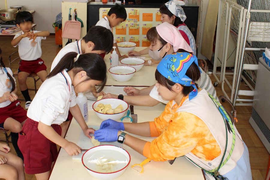 サツマイモは先日の「芋掘り」で収穫したものも少し使い、先ずはピーラーで皮むきをし、包丁でイチョウ切りにも挑戦しました。