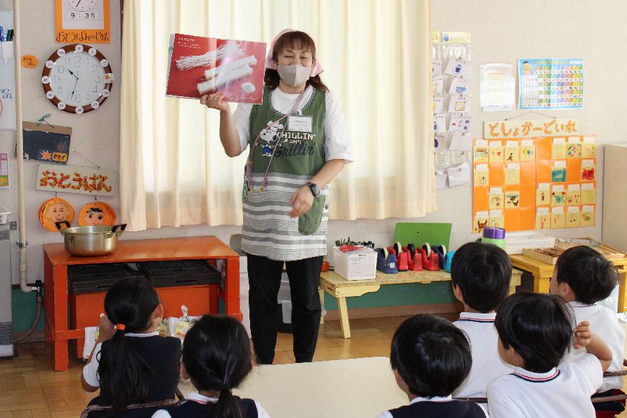 年長組のクッキングも一学期に行った『春キャベツのおかず作り』、『豆腐作り』に続く第3弾を迎え、サツマイモを使った秋のおやつとして『芋羊羹作り』を体験しました。