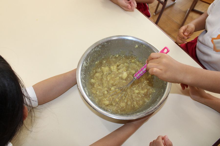 茹で上がったサツマイモはボールに入れて少し冷まし、子どもたが片手にビニールをはめ潰していきます。触感が滑らかになるためになるべく粒粒が残らない様に頑張りました。