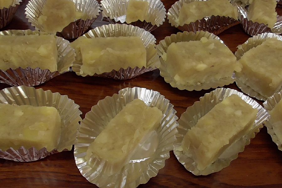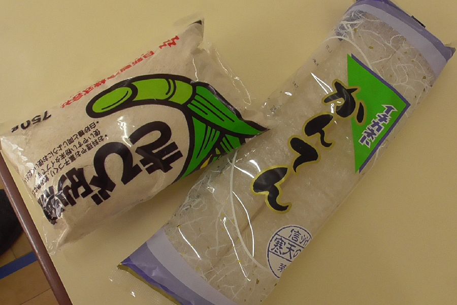 その間、子ども達は材料の角寒天(棒寒天)やキビ砂糖の事についても学びを深め、キビ砂糖や茹で上がったサツマイモの味見もしました。