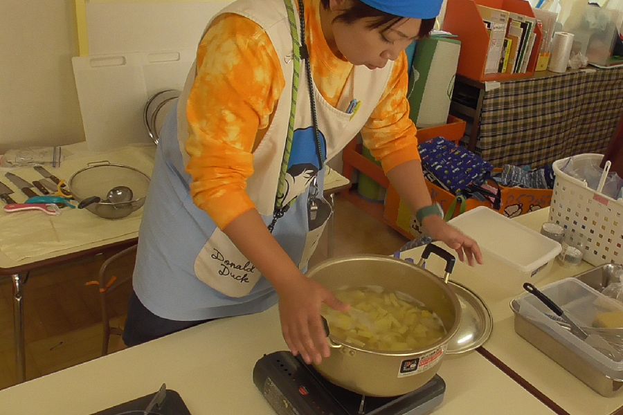切ったサツマイモはカセットコンロに鍋をかけ煮込みます。主任のまゆ子先生が丁度良い茹で加減を見極め茹であげてくださいます。