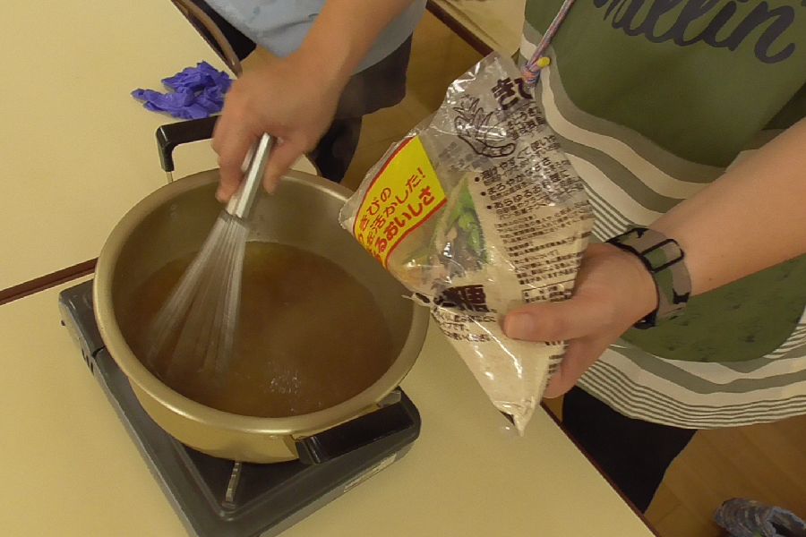 そして皆に少しずつ角寒天(棒寒天)を渡し、ちぎって細かくしたものを一つの鍋に集めて鍋で煮込みます。その中にキビ砂糖を加えると寒天シロップが出来上がります。