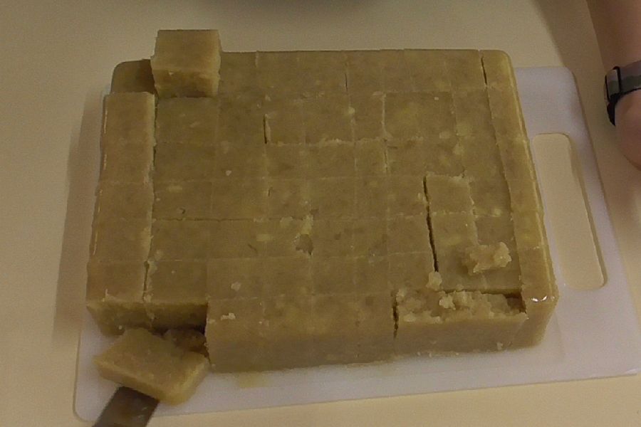 タッパーに流し込み、冷蔵庫で冷やして待つ事約一時。切り込みを入れタッパーを逆さまにして叩いて取り出したら美味しそうな芋羊羹が完成しました。