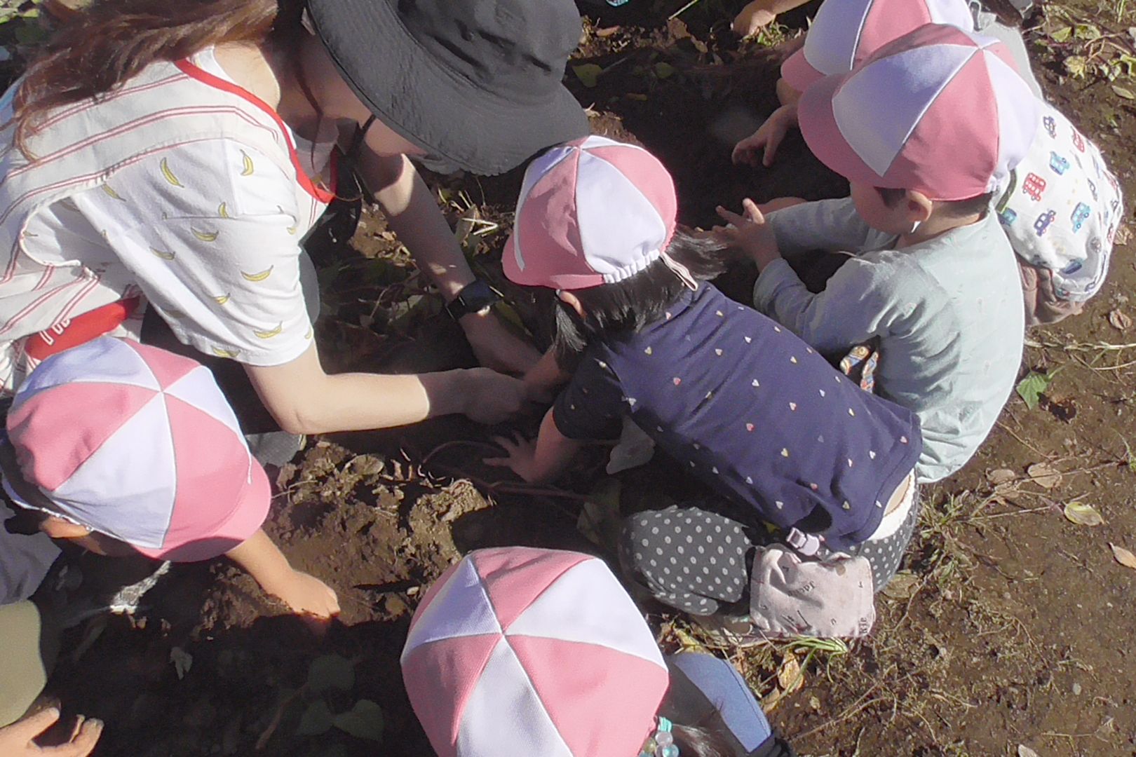 まずは先生達が畑をチェックしました。伸びた芋の蔓(つる)を引っ張るとお芋がくっついていました。早速一株に2~3人ずつ付き「エイエイオー!」の掛け声の合図で一斉に掘り始めました。
