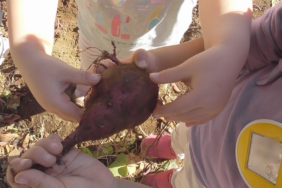 子ども達は道具を使わずに土の感触を楽しみながらモグラさんになって自分の手で掘りました。紅色のサツマイモが顔を覗かせると「あったー!」と掘り当てた喜びで大興奮の様子でした。