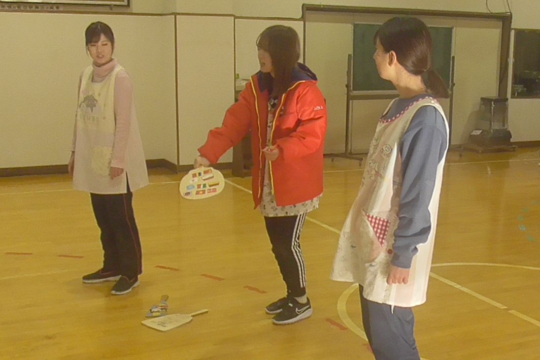 新年の挨拶を交わした後、司会の先生からお正月遊びの一つ『羽根つき』の紹介と、羽子板の扱い方についてお話しました。