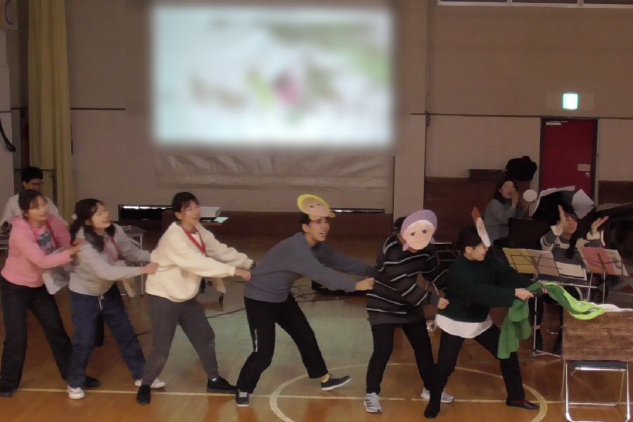 次のお話しも年少組の課題図書の一つ、ロシアの昔話「おおきなかぶ」でした。スクリーンの絵と同時に教師も配役に加わり、「うんとこしょ、どっこいしょ」の掛け声で会場が一体になりました。