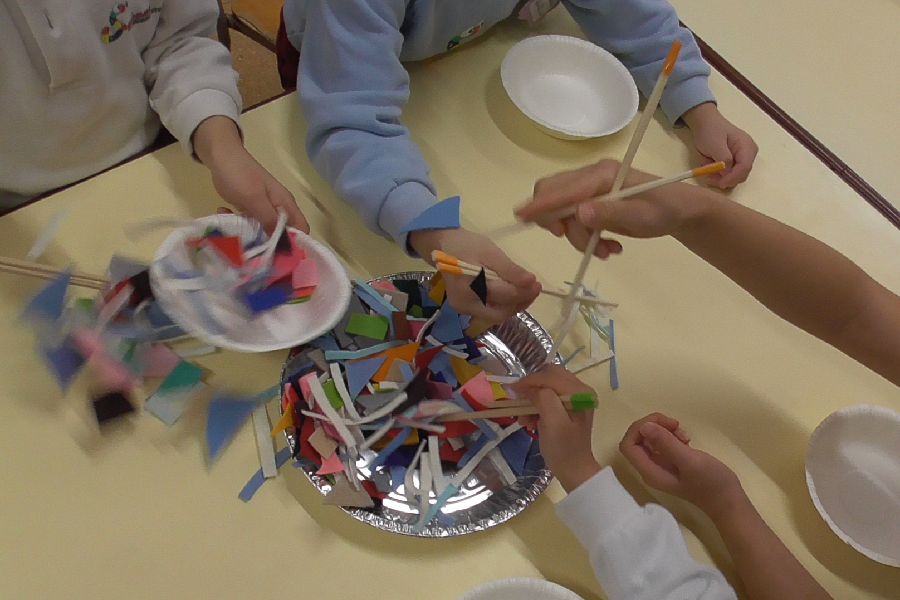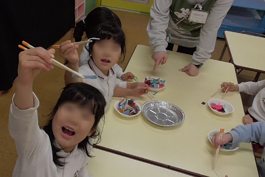 大きいもの、小さいもの、細いもの、三角形のものなど、これと決めたものを紙皿に取り分けます。毎日のお弁当で鍛えられているのでとても上手に箸を扱っていました。