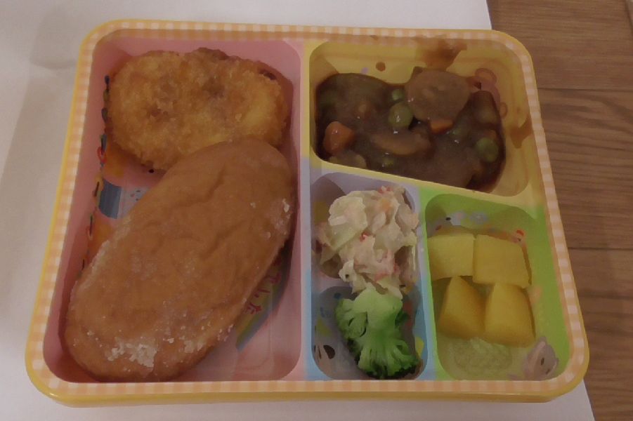 給食も今月からリニューアルしてデザート付きのメニューに変わりました。温蔵庫で温める11月まではこちらの給食になります。(※この日は揚げパンでした)