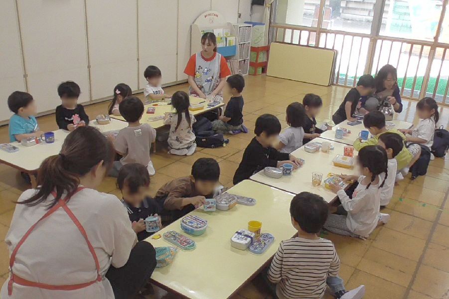 年少組の子ども達は朝からお昼が待ちきれない様子でした。クラスで机を並べて初めての昼食、とても嬉しそうでした。