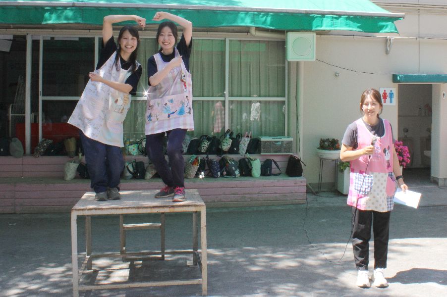 手作りプレゼントは手形があしらってある実用的なバッグです。「これからたくさん使ってね」と子ども達。