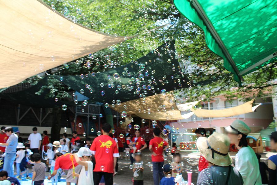 運動会の次の企画は『シャボン玉大会』でした。各自が持ち寄ったシャボン玉器で園庭中がシャボン玉でいっぱいになりました。