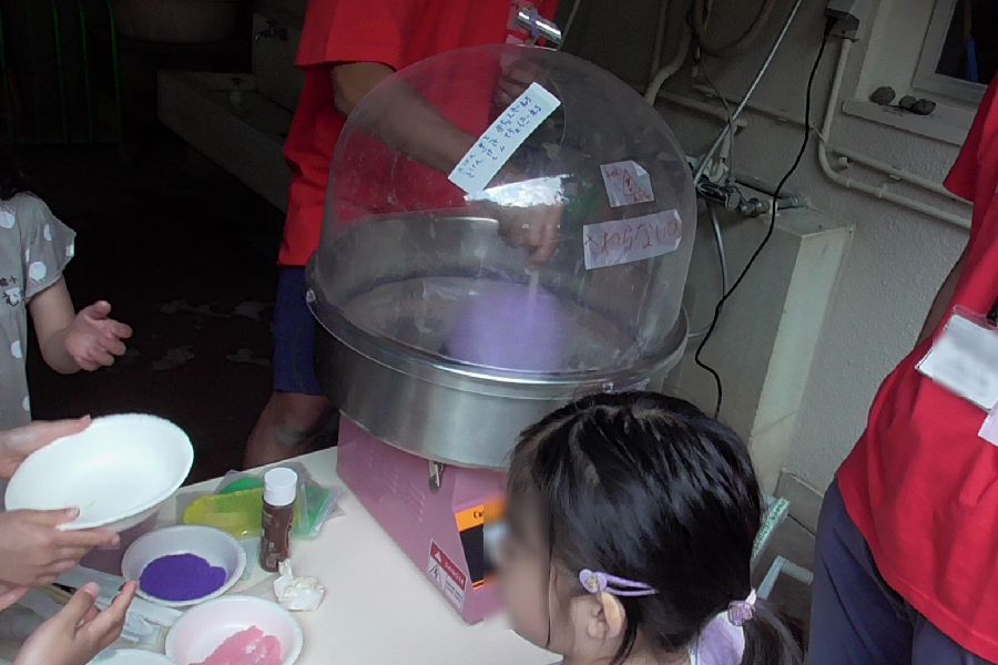 そして食後にはおやじ倶楽部が所有している業務用の綿菓子マシーンで恒例の綿菓子もふるまわれました。綿菓子の色は子ども達が好きな色をリクエストして作ってもらえます。