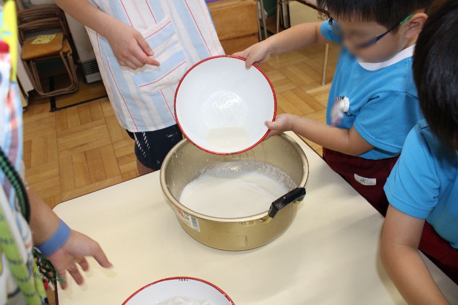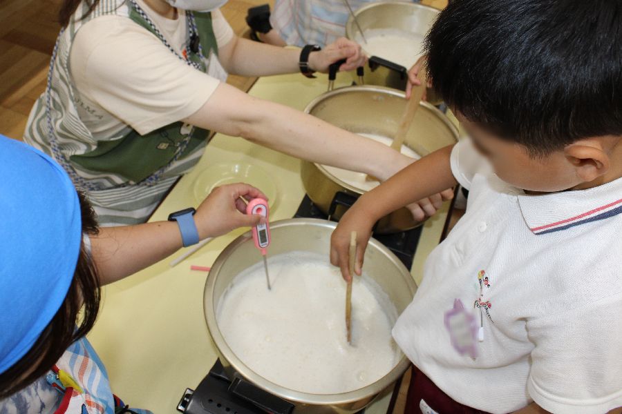 呉汁を絞布に入れ豆乳を絞り出す作業は子ども達が行いました。そして絞り出した豆乳は再度温め滑らかに仕上げるために子ども達がへらで焦げないようにかき混ぜる体験もしました。