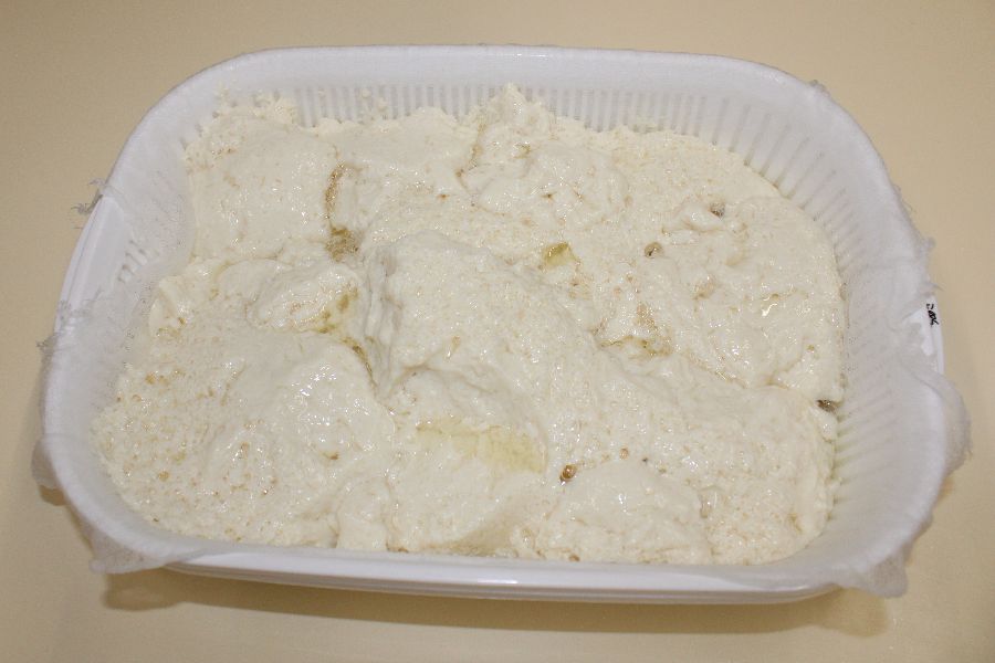 豆乳に苦汁(にがり)を加え固まり始めたらこし布に移して包み、重しを乗せるとぽたぽたと水分が落ちます。