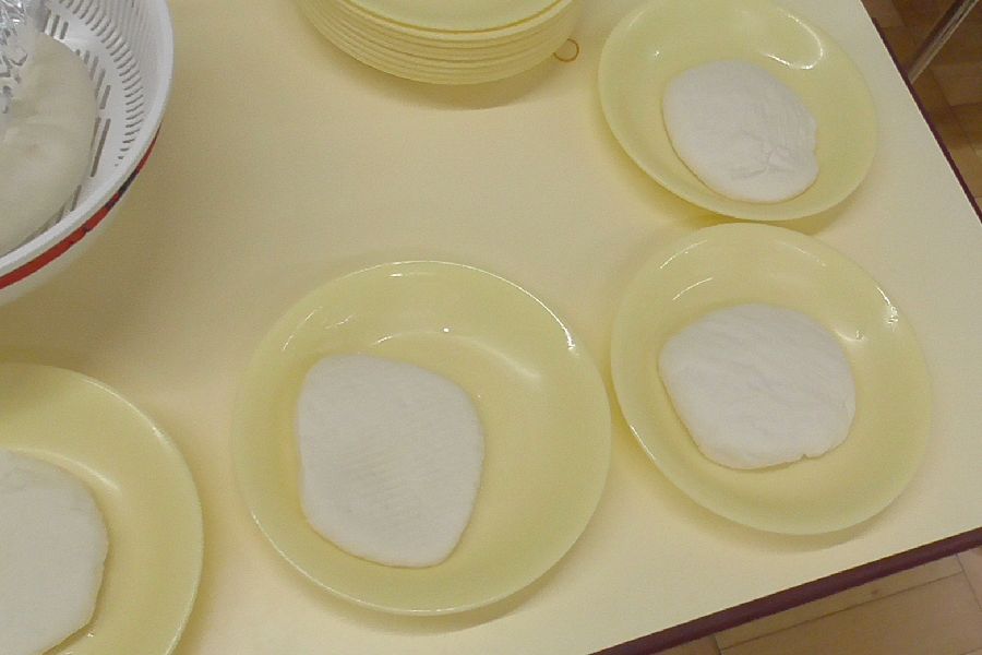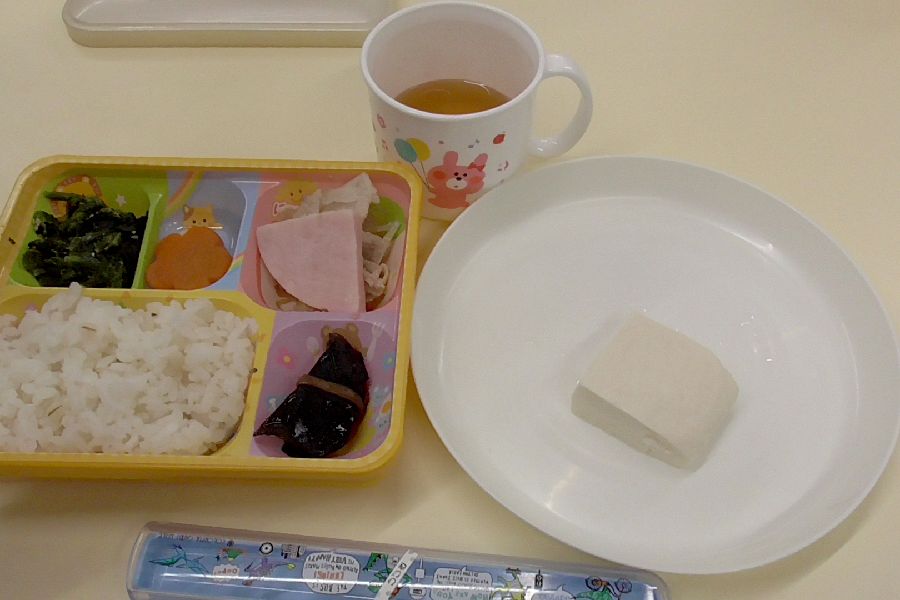 こし布をゆっくりとはがすと美味しそうな「木綿豆腐」ができました。また重しを乗せずに作ったざる豆腐と共にお弁当と一緒にいただきました。