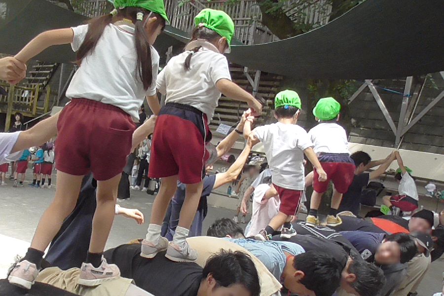 保護者が連なりまるでベルトコンベアの様に子ども達を運ぶメニューは『親子であそぼう』ならではのもの。もちろん子ども達は大喜びでした。