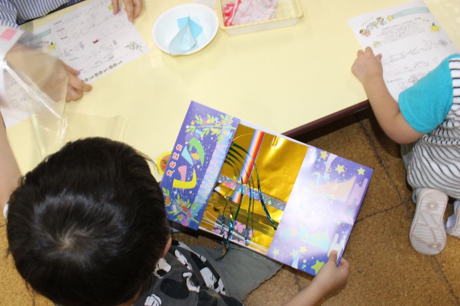 年少組には七夕制作用のキットとも配られいろいろな笹飾り作りに挑戦しました。