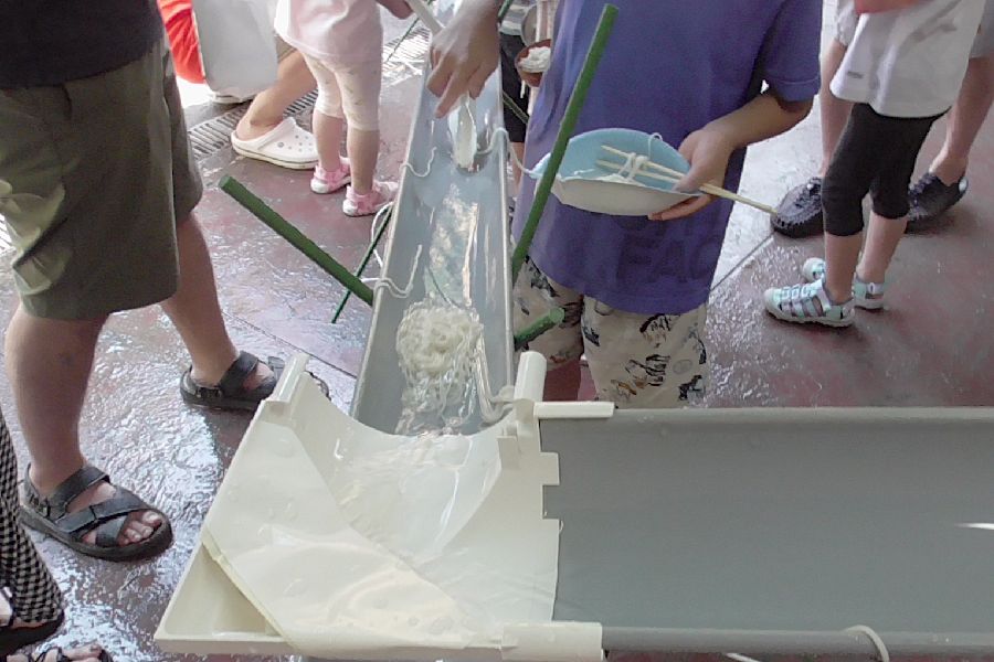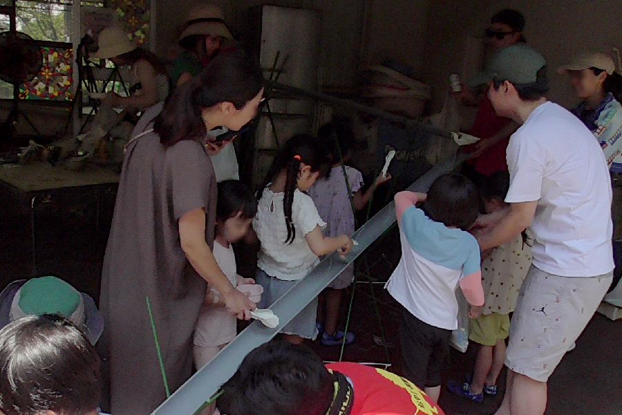 今年の流し素麺はコースを伸ばしL字にして角度をつけて行いました。こういった工夫と遊び心はお父様ならではですね。