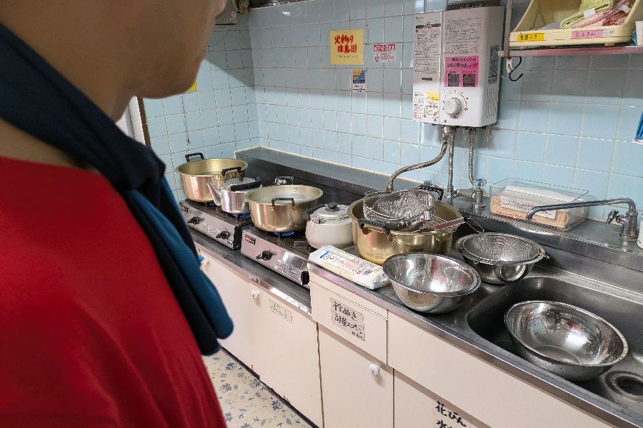 一方でちゃくちやくと準備が進められていたのが流し素麺の準備です。麺を茹でていた給湯室はサウナの様でした。
