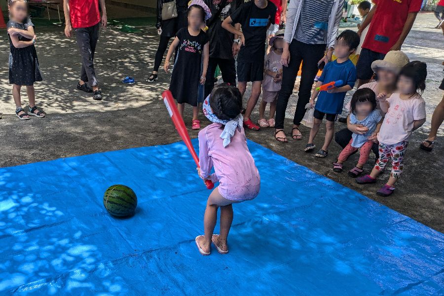 素麺の準備ができるまではスイカ割り大会も行いました。小さい子は目隠しなしにしておもちゃのバットで楽しみました。