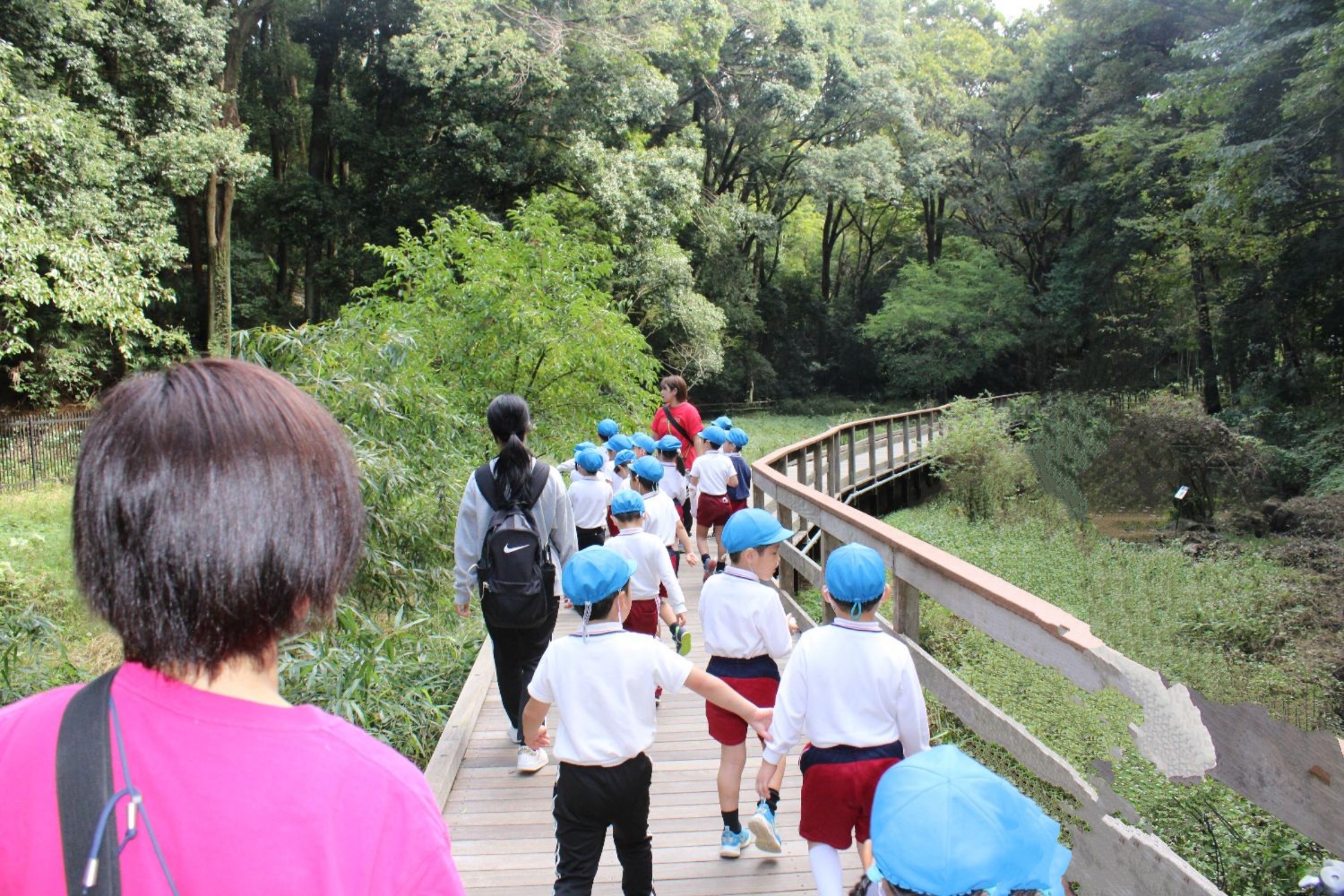 最初はクラス毎に、広大な敷地内にある湿生植物園の木道を先生や帯同してくださった保護者の方と一緒に散策しました。時折足を止めて珍しい植物や生き物を観察しながら大自然を満喫しました。
