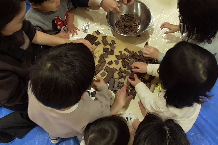 まずは板チョコを細かく砕きます。出来るだけ細かくすると溶けやすいので親子で手分けして取りかかります。