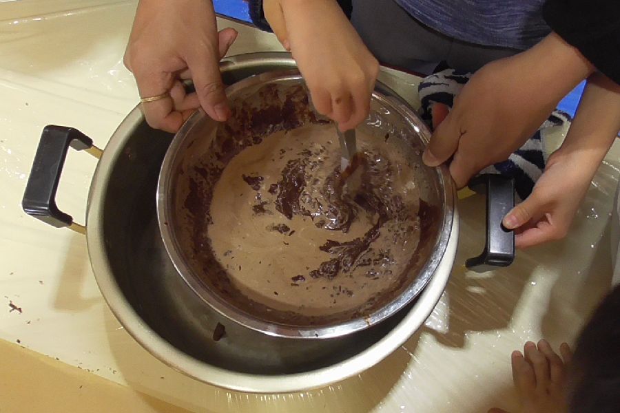 『チョコ作り』はおやじ倶楽部にとって初の試みです。しかも参加者は37家族。用意したチョコレートが足らず急きょ追加で調達しました。