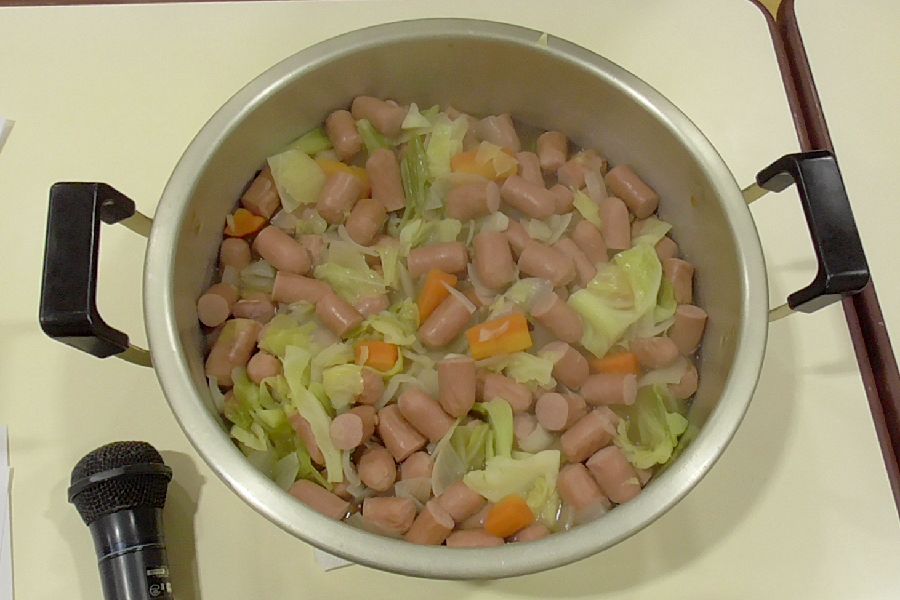 コンソメでじっくり煮込んだポトフは大きな寸胴鍋二つにたっぷり。野菜の甘味とソーセージの塩味が絶妙な子ども達に優しい味に仕上がりました。