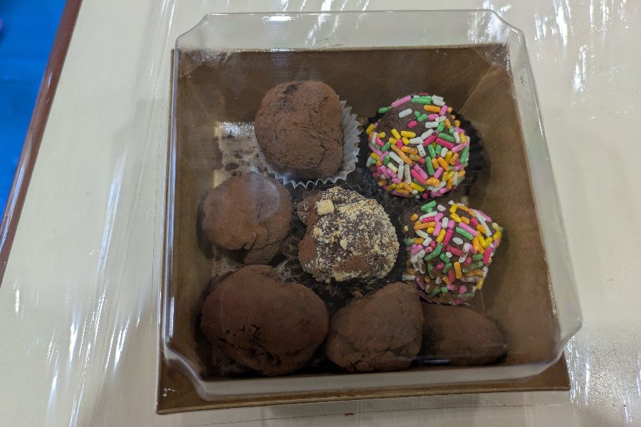 固まった生チョコを球状に丸めてココアパウダー、カラースプレー、ナッツなどをまぶし、専用の箱に詰めたら『トリュフ』の完成です。