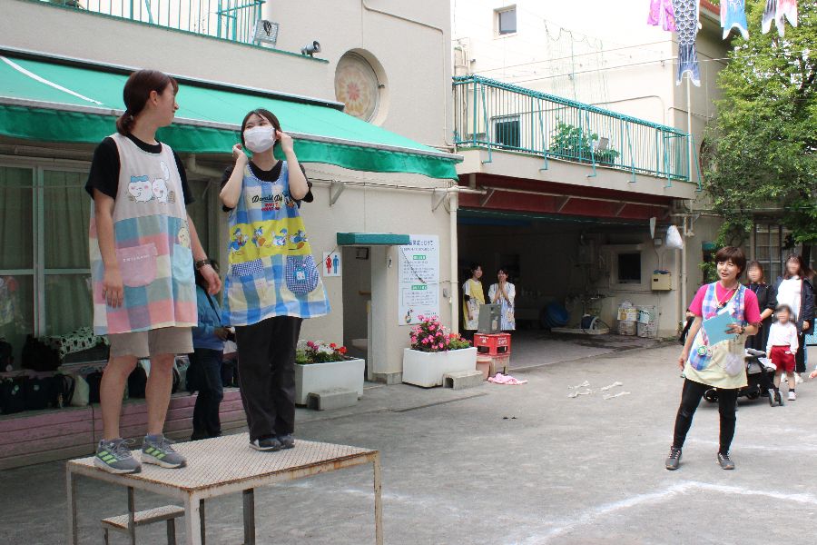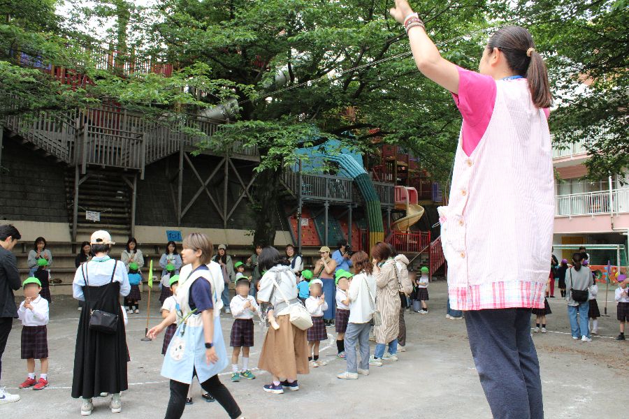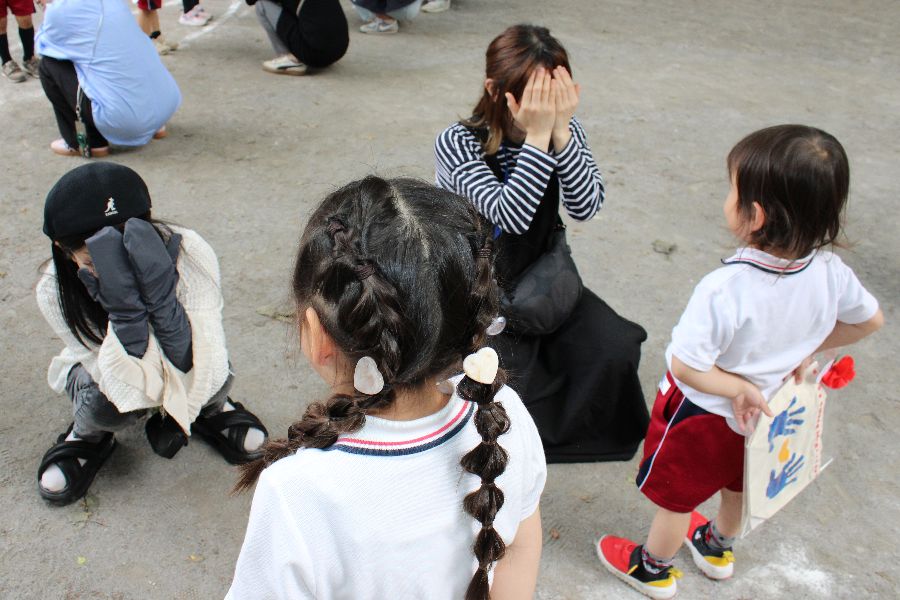 年少と満三歳児は室内で、年中組と年長組は園庭にそれぞれ集うと、親子でじゃんけんゲームしたりスキンシップ運動したり、リズムをダンス踊ったりしました。