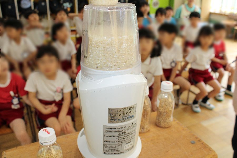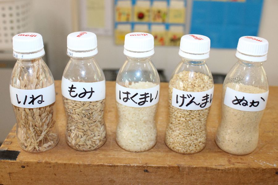 田圃から稲を収穫し脱穀した籾を剥いて玄米を取り出したり、玄米を精米機で白米になる様子を観察するなどまるで本格的な授業の様です。