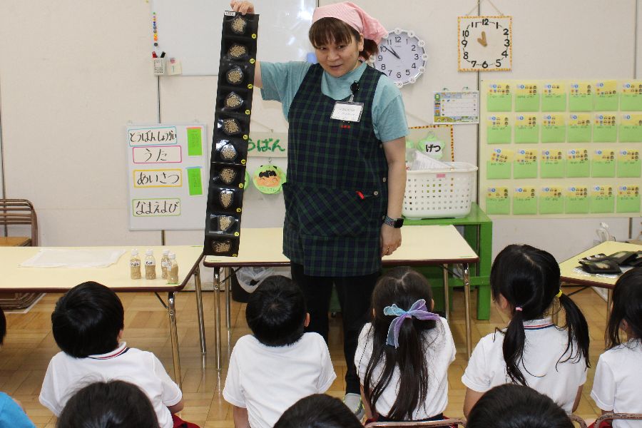 午前10時からお昼までの長時間でしたが、副園長が米や旬野菜に関連した事を次々に問いかけ考えさせながら進めているので、子ども達は最後まで飽きずに集中して参加していました。