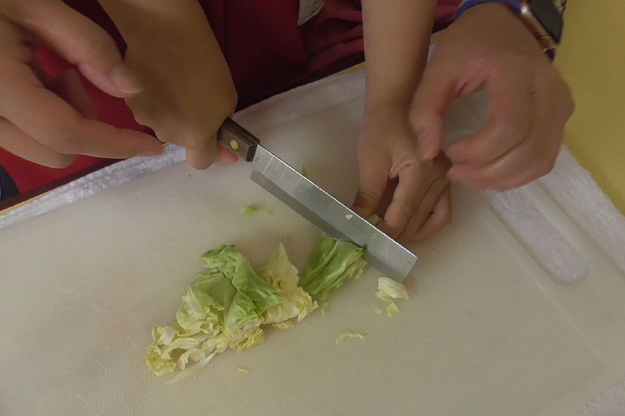 そして旬野菜のキャベツを切る体験もしました。初めての包丁体験も、使い方を丁寧に伝え教師が後方から手を添えながら行いました。