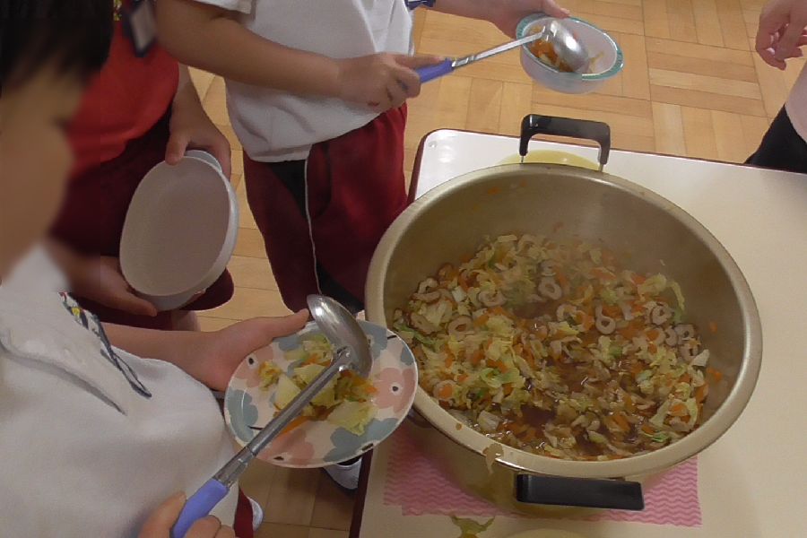 子ども達はおかずの煮込み野菜をよそう体験もしました。おたまを鍋の端に付けて水分を切る事も覚えました。