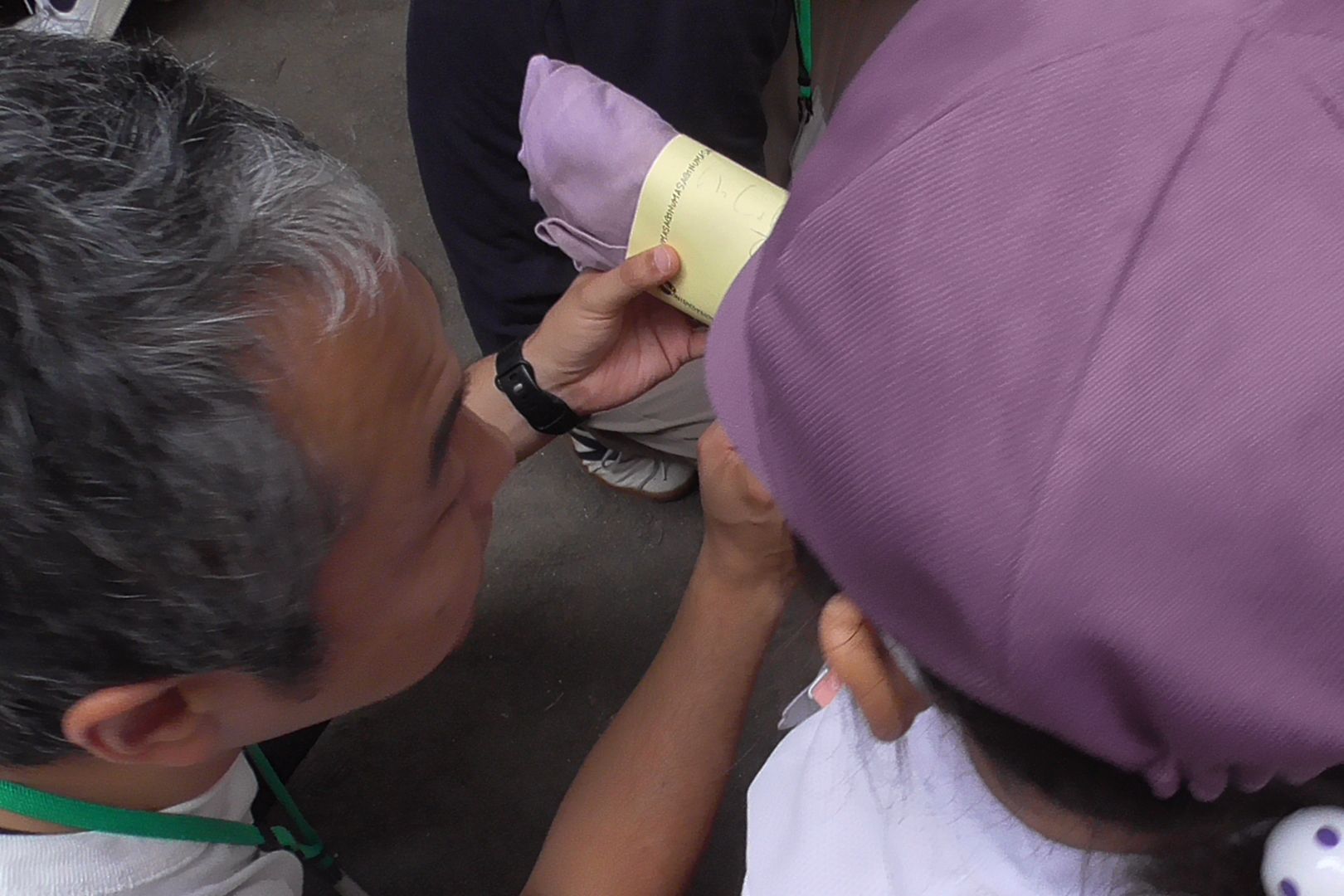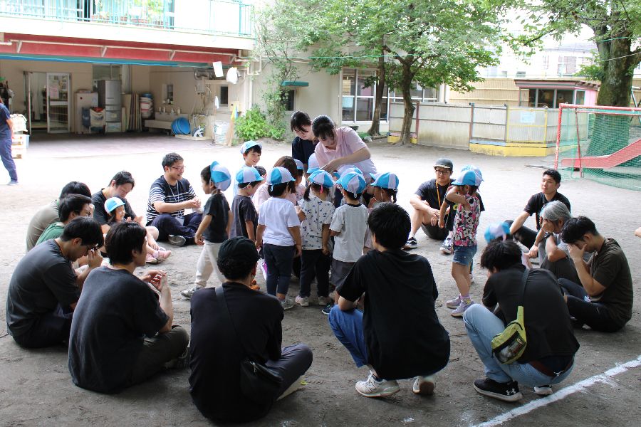 お昼過ぎの第3部は年長組が集いました。小雨がぱらつく中でしたが園庭には木蔭と全面にシェードが張られているので午前中同様に外で開催しました。