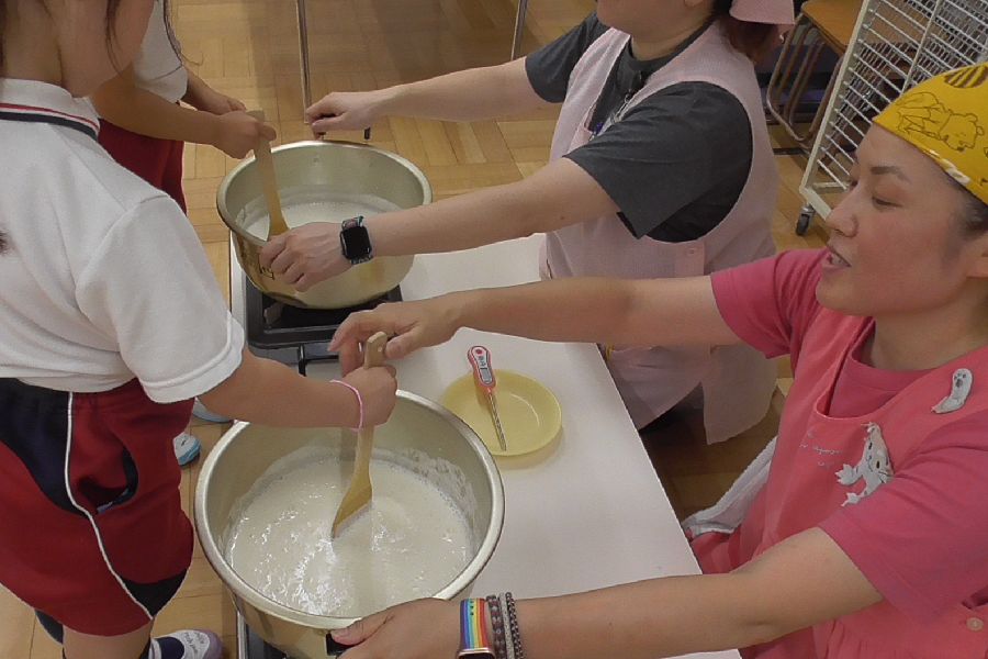 絞り出した豆乳は再度温めて更に滑らかに仕上げます。豆乳が焦げない様にヘラを使ってかき混ぜる作業も子ども達が順番に体験しました。ヘラが鍋底を擦る要領で上下、左右にゆっくりと動かしました。