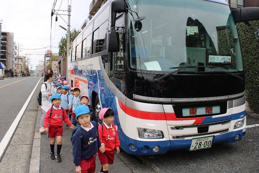 東急の観光バスを3台チャーターして年中組と年長組がペアのクラスで乗り込み公園まで向かいました。