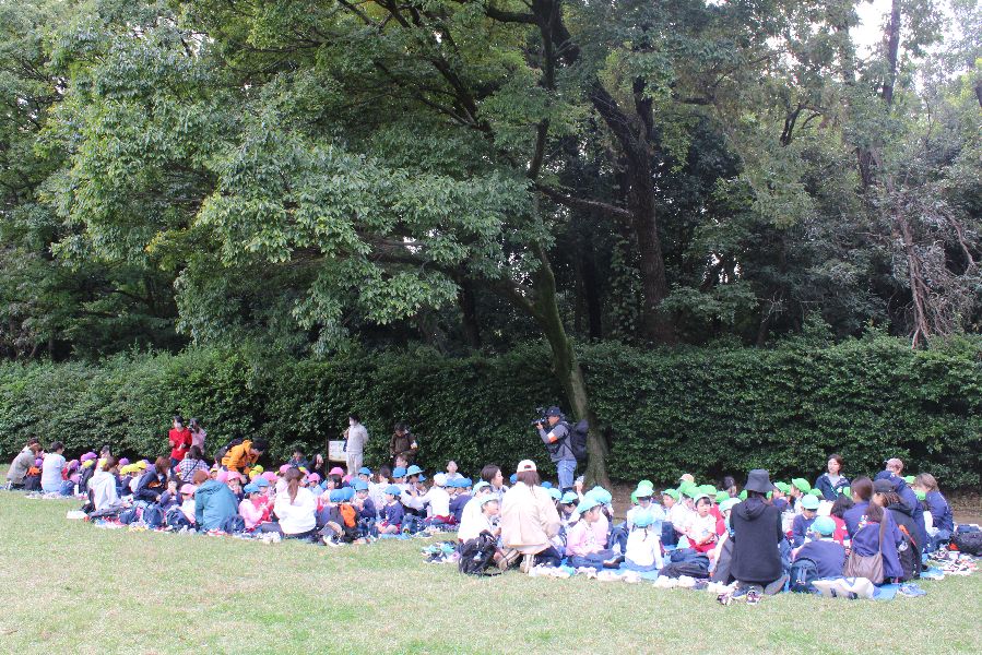 昼食は拠点にしている『古代芝生広場』に大型ビニールシートを敷き、6クラス一緒に弁当をいただきました。遠足の日はデザートやフルーツに加えてお菓子もOKです。