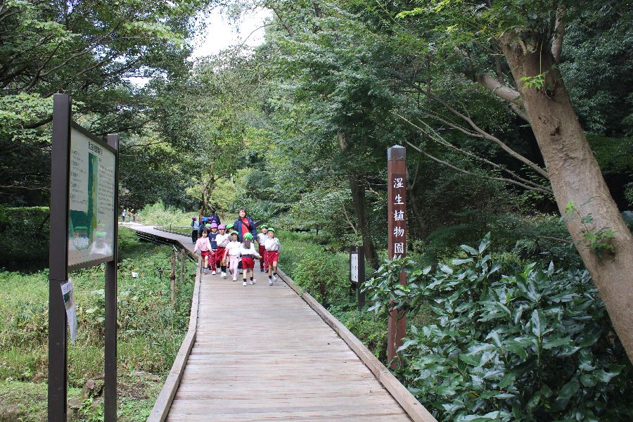 最初は広大な敷地内にある湿生植物園の木道を先生や帯同して下さった保護者の方と一緒に散策して回ります。時折足を止めて植物や生き物を観察しながら、大自然を満喫しました。