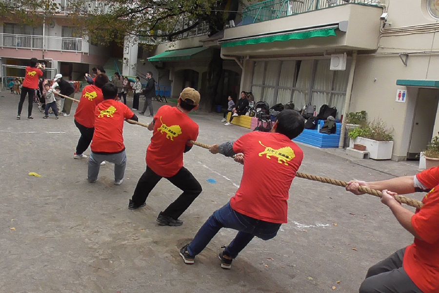 ミニ運動会では父子対抗で『尻尾取り』や『綱引き』を行ったり『玉入れ』『障害物競技』などを楽しみました。