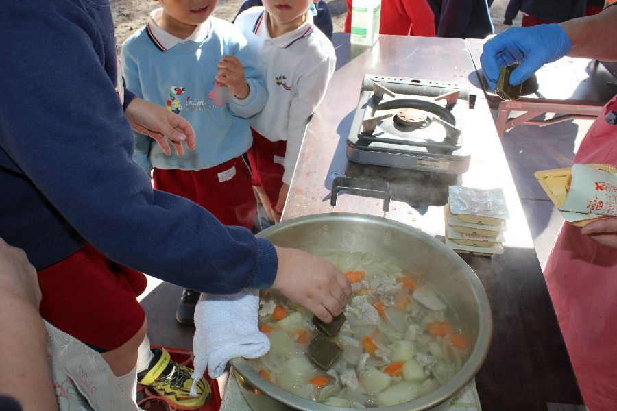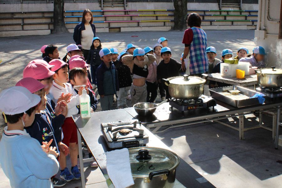 年長組は鍋とカセットコンロを持ち込み各クラスで調理し、その他の学年の7クラス分は園庭側ピロティーにカセットコンロを並べて副園長とフリーの先生2名で調理します。