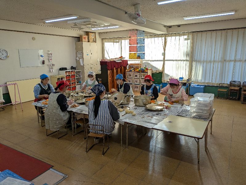 先生たちは早く出勤し野菜の皮剥きなど下準備に大忙し。更に細かく調理するのは年長組が行います。