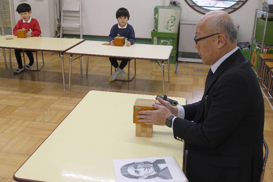 1月下旬よりクラスを8~9名ずつの3グループに分け、約一時間園長が指導しました。恩物は箱からの出し方や片付け方などを細かく手順が定められており、それに従い遊びを進めて行きます。